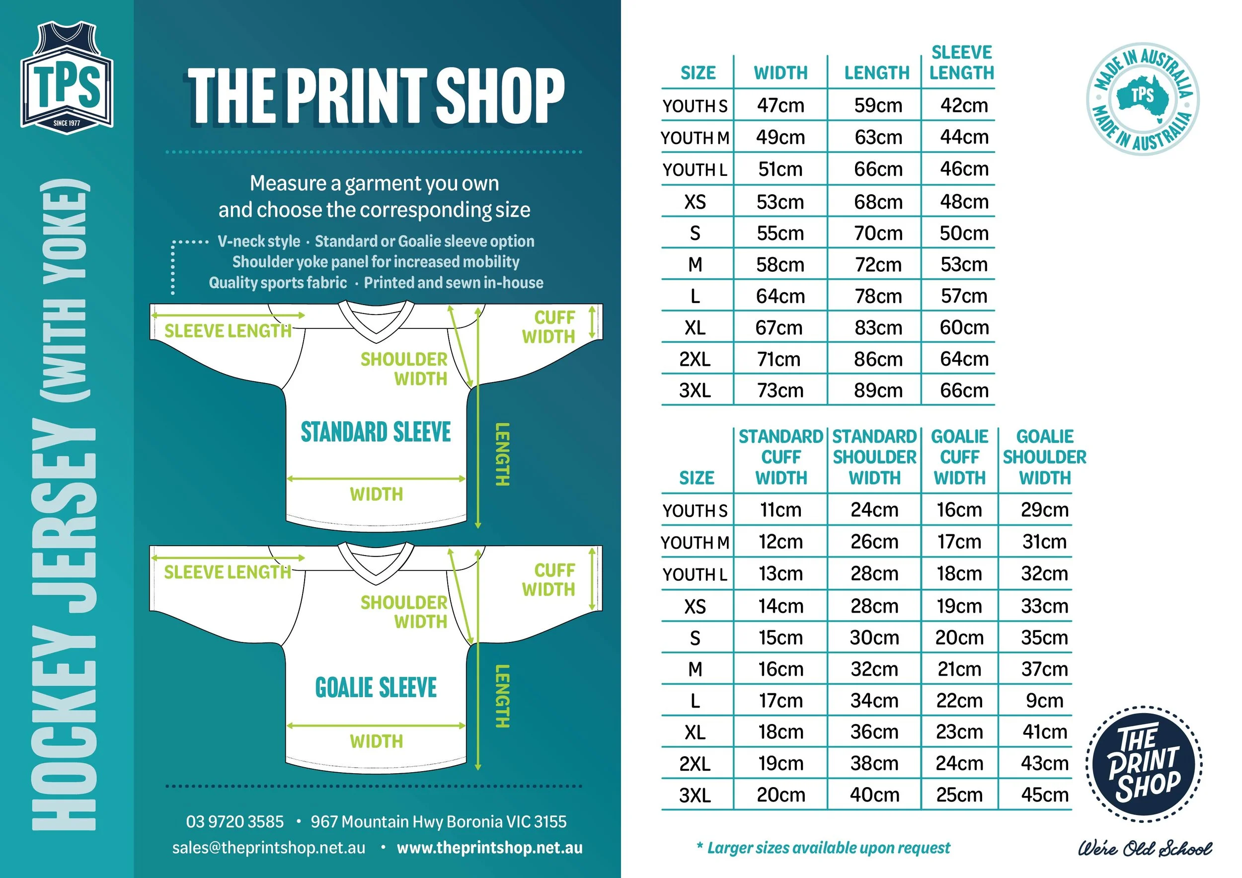 Our Hockey Jerseys are v-neck style and available in wide range of sizes from youth through to adults. The Print Shop custom Hockey Jerseys come in two styles, either regular fit or with shoulder yoke for a superior fit. Both Hockey Jersey styles are available in standard sleeve or a larger goalie sleeve option.