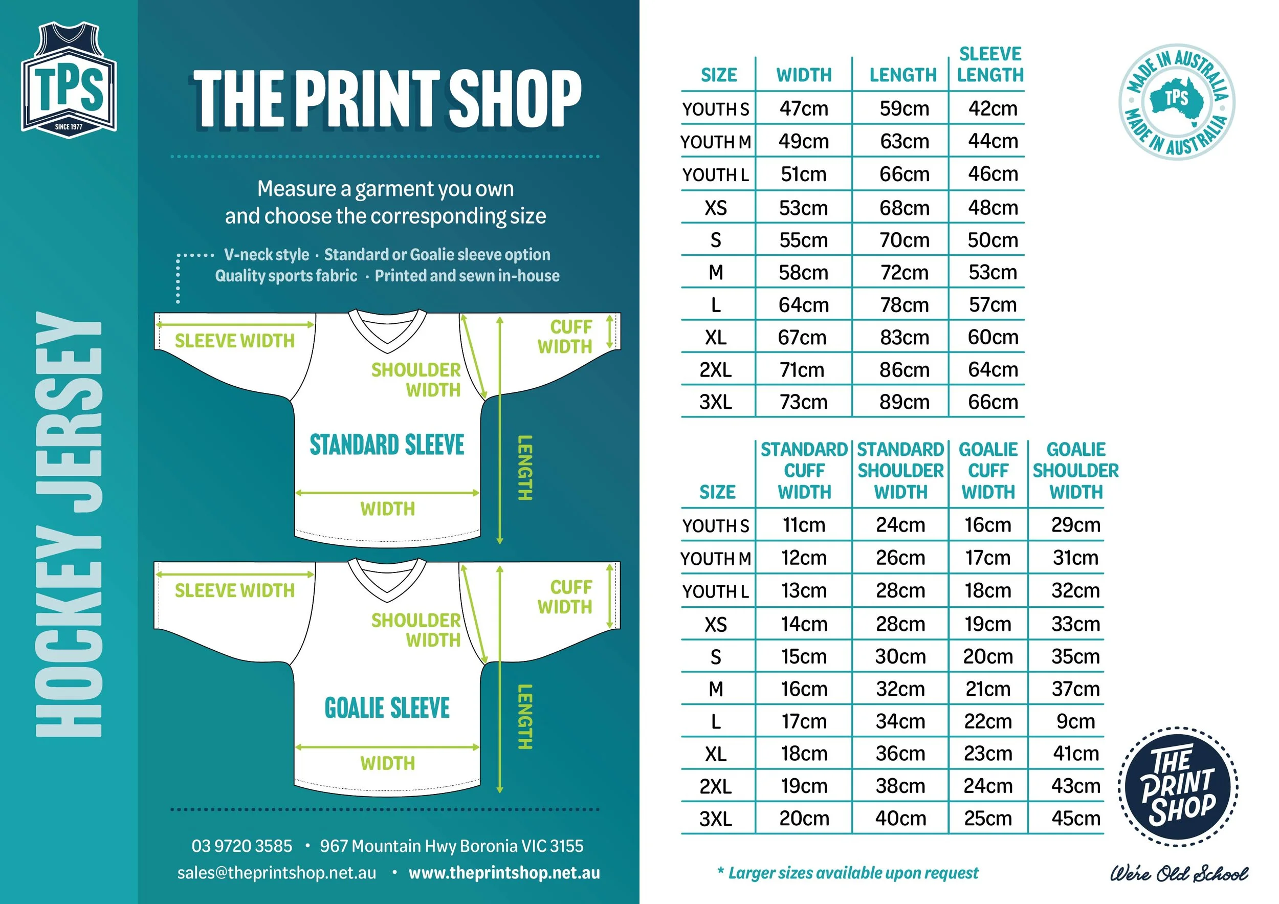 Get in touch today to find out how The Print Shop can create a truly unique look for your team. Would you like a custom design or team logo? No problem, get in touch at sales@theprintshop.net.au and we can help you with your request.